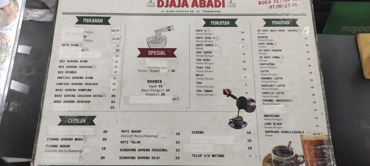 Djaja Abadi (Djayadi) is a cozy coffee shop located on Jl. Niaga Timur in Samarinda, offering a welcoming atmosphere perfect for relaxing or getting work done. The menu is a vibrant blend of local and familiar flavors, highlighted by their mie nyemek with a balanced sweetness, and the savory kwetiaw goreng known for its satisfying taste. Their kopi Turki and kopi susu cater well to coffee lovers, though sweetness levels may vary by preference. The roti panggang comes out delightfully moist, adding a comforting touch to the lineup. While some items like pisang goreng madu received mixed reviews, the general consensus praises the friendliness of the staff and the cleanliness of the space. Djaja Abadi delivers a solid casual dining experience with affordable prices and a menu that invites exploration beyond the usual coffee shop fare. It’s a spot where good food meets good vibes, making it a favorite among locals.